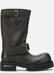 Stivali "Venom" Balenciaga, realizzati in pelle con finitura ad effetto consumato. La struttura presenta una silhouette compatta, caratterizzata da cinturini con fibbie regolabili disposti trasversalmente sulla tomaia. La fotoincisione del logo Balenciaga e dell'indirizzo 10 AV George V 75008 Paris è visibile sulla superficie superiore, mentre una targhetta incisa con il logo è applicata lateralmente sulla suola. La base integra una curvatura pronunciata di 20 mm.
