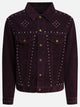 Giacca in velluto a coste Needles, con costruzione ispirata al modello classico delle giacche di jeans. Il capo è realizzato principalmente in velluto a coste, ottenuto da una composizione tessile con prevalenza di cotone. La struttura presenta una silhouette dritta e dettagli rinforzati nelle cuciture. La superficie è caratterizzata dall'applicazione regolare di borchie rotonde, a stella e di tipo gioiello disposte su fronte, maniche e retro.