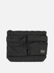 Borsa a tracolla "Force" Porter-Yoshida & Co, realizzata con esterno in nylon industriale intrecciato 210 denari 6, presenta una struttura compatta con silhouette minimale e superfici uniformi. Il design, ispirato all'estetica militare, mette in evidenza differenze sottili tra il tessuto della tasca anteriore e il corpo della borsa. L'interno in nylon ripstop trapuntato richiama la fodera delle giacche militari e introduce un contrasto funzionale nelle superfici.