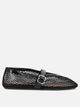 Ballerine Mary Jane in rete Alaïa, costruzione a silhouette bassa con tomaia in tessuto a rete e dettagli in pelle verniciata. La struttura presenta una punta arrotondata e un cinturino regolabile con fibbia posizionato sulla parte superiore del collo del piede. La suola piatta è realizzata in gomma, garantendo stabilità e supporto. Ispirazione alle scarpe tradizionali giapponesi. Linee essenziali e materiali sovrapposti a contrasto.