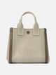 Borsa a spalla tote "Carry" Chloé, realizzata in tela jacquard a righe composta per il 91% da cotone, 6% poliestere, 3% altre fibre. La struttura è definita da un corpo rigido con silhouette regolabile tramite magneti laterali che consentono una configurazione compatta e arrotondata. Fasce verticali in pelle di vitello e logo oversize caratterizzano le finiture esterne. Doppi manici e tracolla regolabile permettono una portabilità su spalla o a mano.
