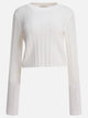 Maglione girocollo "Tinos" Loulou Studio in maglia, caratterizzato da una silhouette cropped con finitura traforata. La costruzione integra maniche lunghe e un profilo minimalista senza dettagli aggiuntivi. Realizzato in tessuto sintetico misto, porta una lavorazione che mette in evidenza la texture semitrasparente. L'assenza di elementi decorativi mantiene la struttura lineare e il taglio netto, adatto alla sovrapposizione o indossato singolarmente.