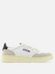 Autry "Medalist Low" sneaker with uniformly textured, natural leather upper featuring microhole work on the toe. The construction features a low-profile silhouette with a padded collar for added comfort and support. The laces are flat cotton, and the tongue is finished with embroidery label applied via exposed stitching. The inner lining combines leather and cotton terry, contrasting molded rubber sole.