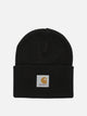 Carhartt WIP "Acrylic Watch" beanie, knit in ribbed knit for a soft, even texture. The model features a stretch cuff that defines its compact silhouette and a close-fitting fit. The minimalist profile is interrupted only by the Carhartt WIP label woven on the front, a distinctive element of the brand.