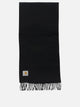 Carhartt WIP wool "Clan" scarf made from fulled pure wool fabric. One-size rectangular construction, edges finished with long bangs on both short sides. Regular, soft surface, tightly woven construction that enhances durability. Square fabric label applied on one end, inserted directly into the scarf structure. Minimalist design oriented on functional simplicity.