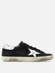 Golden Goose "Super-Star" sneaker, made with a nappa leather upper and low structure. The silhouette features visible stitching, perforation on the toe and flat rubber sole. Distinctive elements include applied side star and contrasting leather back reinforcement. Traditional cotton lace-up closure and fabric-lined interior profiles. Matte finish with wear-resistant treatment and worn effect details.