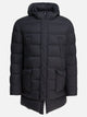 Herno long hooded down jacket with padded construction, made of wool and goose down blend. It features a linear silhouette, extended-length structure and integrated hood. The front closure is concealed by a zipper, while the sleeves are long. The front includes two welt chest pockets and two flap pockets. The hem is straight and the design focuses on functionality and protection from the elements.