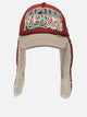 Kapital "Kapsize Rule" trucker hat with ear flaps made of boa material. The design features a contoured front panel and curved visor, while the earmuffs have buttons for attachment above the head or under the chin. The outside of the earmuffs combines a print on the left side and mesh material on the right side. The silhouette maintains the typical rigid construction of the trucker references.