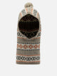 Kapital "Yellowknife" balaclava, made of knit with geometric jacquard pattern across the entire surface. The integral construction wraps around the head, neck and upper torso, leaving a wide frontal opening for the face. The bottom edge is finished with stretch ribbing to promote a snug fit, while the top is completed with an appliquéd pompom. The woven branding label is positioned on the side.