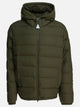 Moncler "Laveraet" down jacket, made of polyester with DIST-certified goose down filling. The construction features a hood with buckles and snaps, a two-way zipper front closure and an adjustable drawstring bottom hem. The silhouette is regular, with structured shoulders and a straight cut. Two front zippered pockets and one inside pocket complete the functional configuration. Fabric patch inside with illustrated washing instructions.