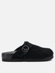 Needles leather "Clog" sabot with closed-toe construction and contoured upper, featuring a wide line. The upper features a distinctive Needles bow-tie motif etched into the surface. The adjustable closure is defined by a metal buckle in the shape of a peace symbol, positioned on the side.