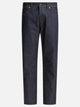 Stone Island "Denim-Rinsed" jeans, constructed of 13.5 oz denim, made of organic cotton with 4-thread twill weave. Five-pocket construction with regular straight silhouette. Curved front pockets and fifth pocket on right side. Star embroidery detail under the left pocket. Reinforced back pockets and Stone Island Denim Research badge with metal buttons applied to the back of the waist. Front button flap closure, upper visible in black. Rinsed finish, contrast stitching.