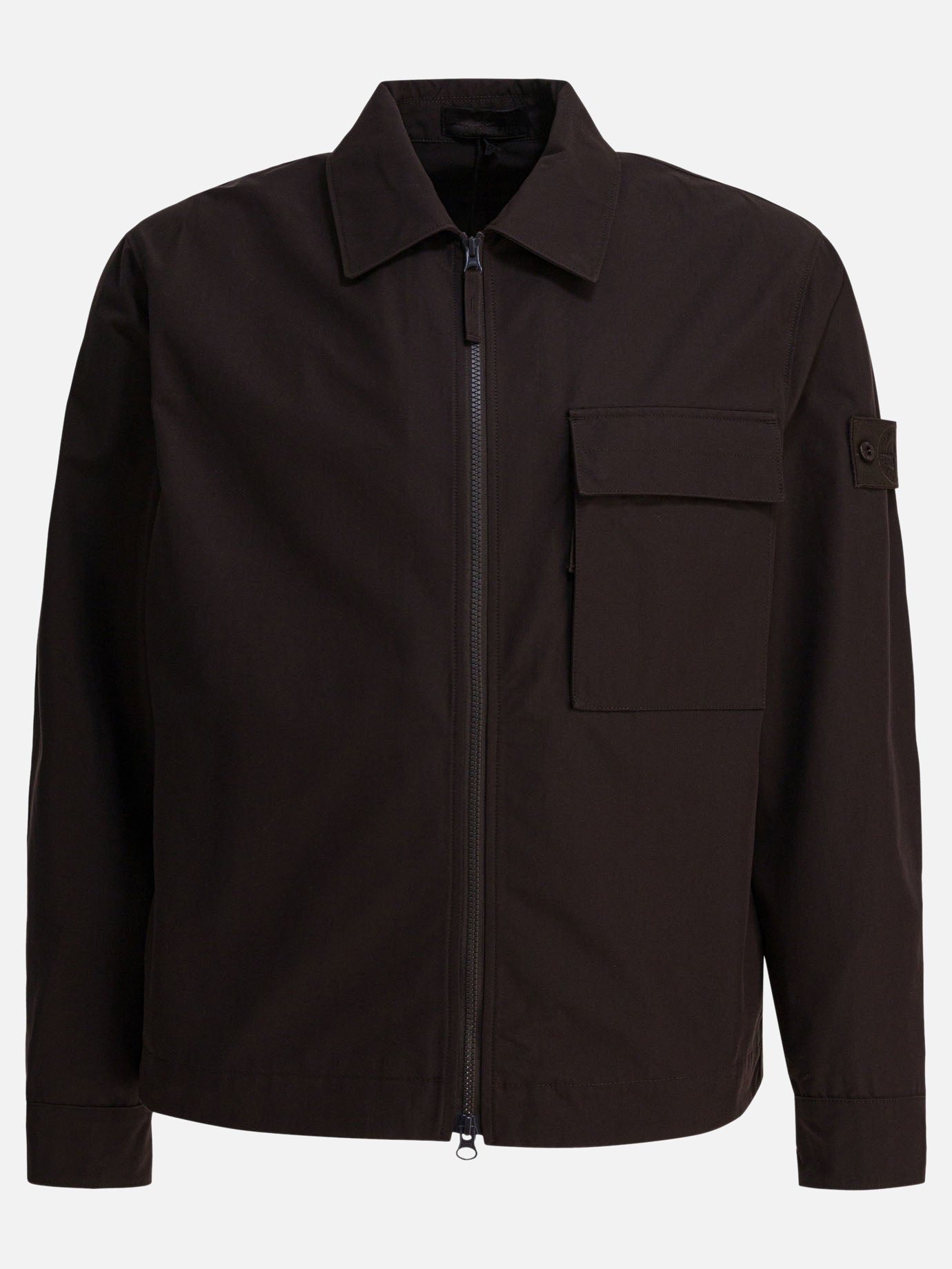 Stone Island organic cotton jacket with lightweight and compact construction. It features a 100% organic cotton fabric surface, a classic structured collar, and an exposed two-way zipper front closure. The design features a straight silhouette, long sleeves with snap-adjustable cuffs and button-adjustable bottom hem. Features a double patch pocket on the chest with a flap and hidden snaps and the other with a zipper, as well as side welt pockets.