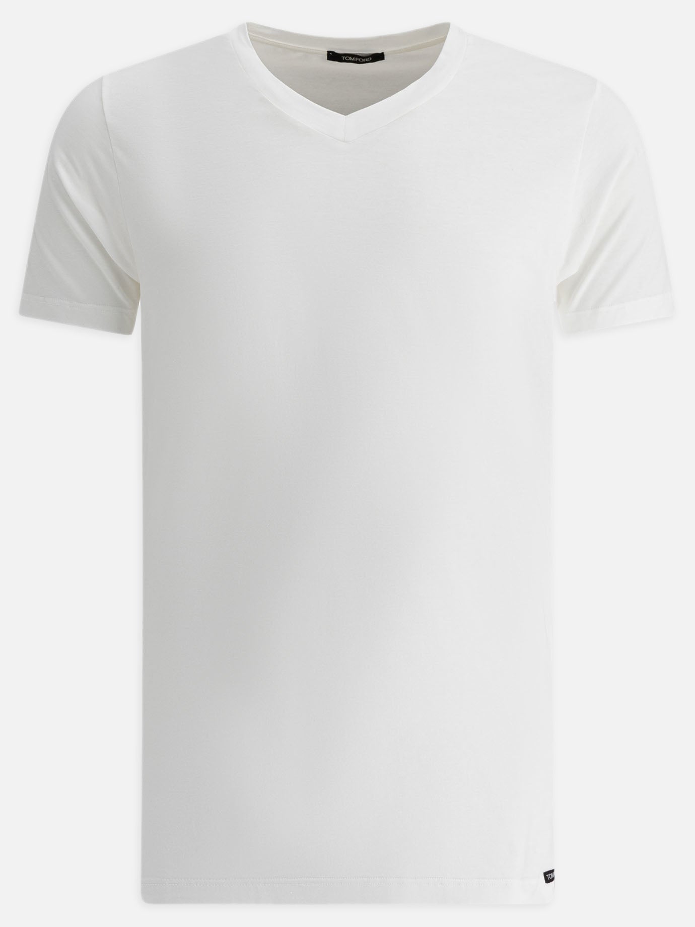 Tom Ford V-neck underwear T-shirt, made of jersey. Short-sleeved construction features a clean V-neckline and a small Tom Ford label applied to the bottom hem. Streamlined, essential silhouette designed for body-hugging fit without visible seams. Stretchy construction ensures tightness and flexibility.