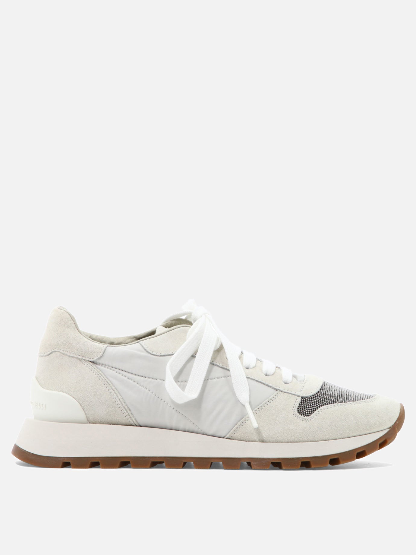 Brunello Cucinelli Precious Toe suede and techno fabric "Runners" sneakers with a low profile and rounded silhouette. Upper combines soft suede and techno fabric side panels with slight shiny effect. Monile embroidered detail at toe. Two-tone heel and back of sole with TPU insert and subtle grooves. Removable insole, lightweight fabric lining.