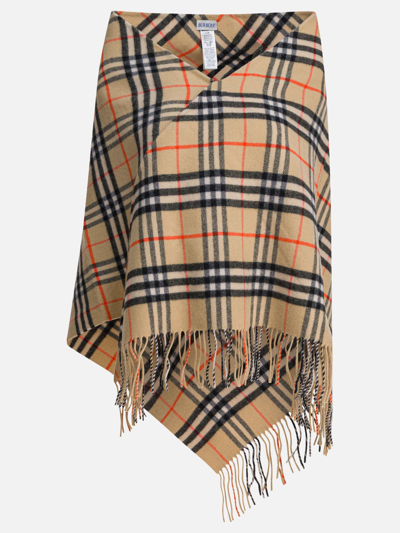 Burberry's "Check" wool and cashmere cape embodies timeless elegance, combining the brand's prestige with unparalleled craftsmanship. Made in an old Scottish mill, this cape sports the classic Check pattern that immediately brings to mind Burberry's iconic style. Its softness derives from a meticulous manufacturing process that includes washes in local spring water, completing a garment that combines tradition and modernity, ideal for the woman who desires sophisticated comfort.