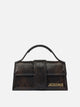 Jacquemus "Il Bambino" handbag, made of grained leather with rigid structure and compact silhouette. The model features a padded top handle, magnetic front flap closure and dyed edge. A flat back pocket is attached to the exterior; visible topstitching defines the profiles. Every metal element, including trim and engraved logo, is silver-plated.