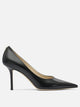 Jimmy Choo "Love 85 mm" pumps, tapered silhouette construction and rigid structure. Made with leather upper and high instep cut-out for added coverage. Pointed toe, mid-profile stiletto heel. Fully leather-lined interior. Sole made of leather, sharp edges and reduced stitching, minimalist lines with no visible overlap.